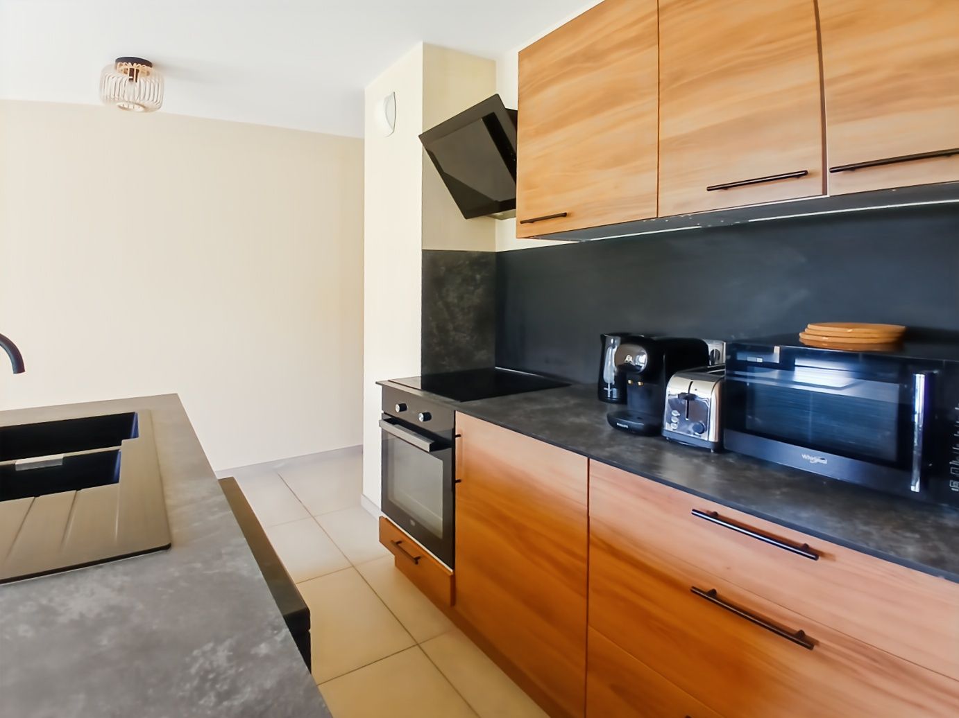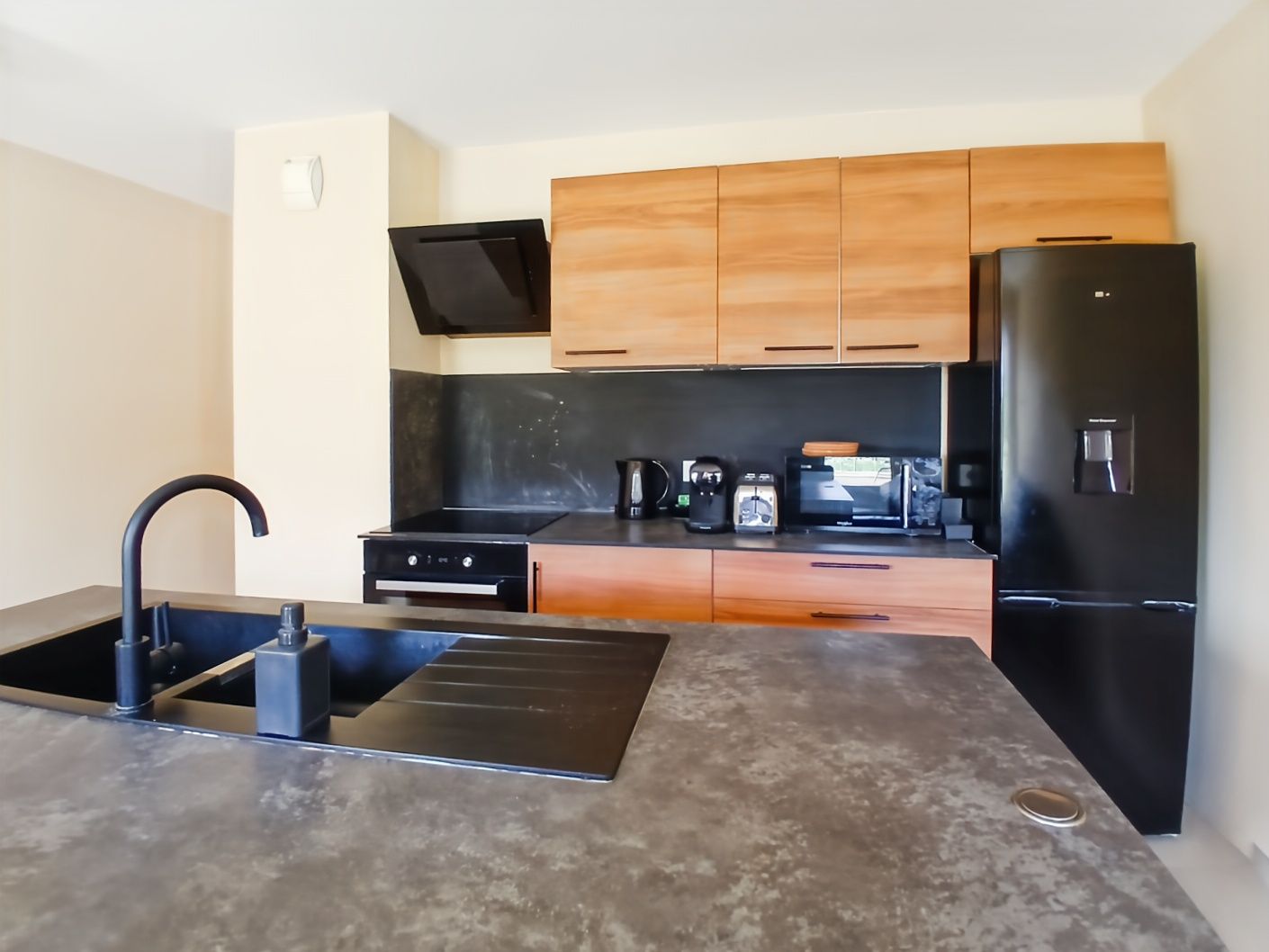 Bel espace de vie : cuisine ouverte entièrement équipée donnant sur la pièce de vie attenante à la terrasse, propice à la convivialité.
