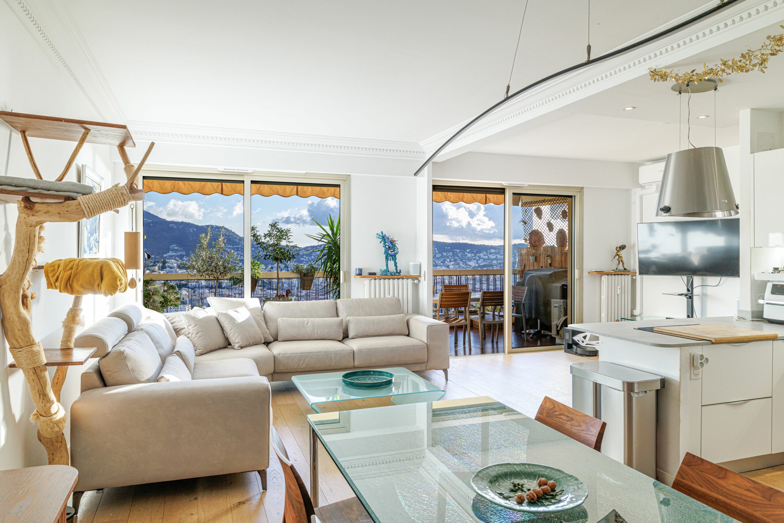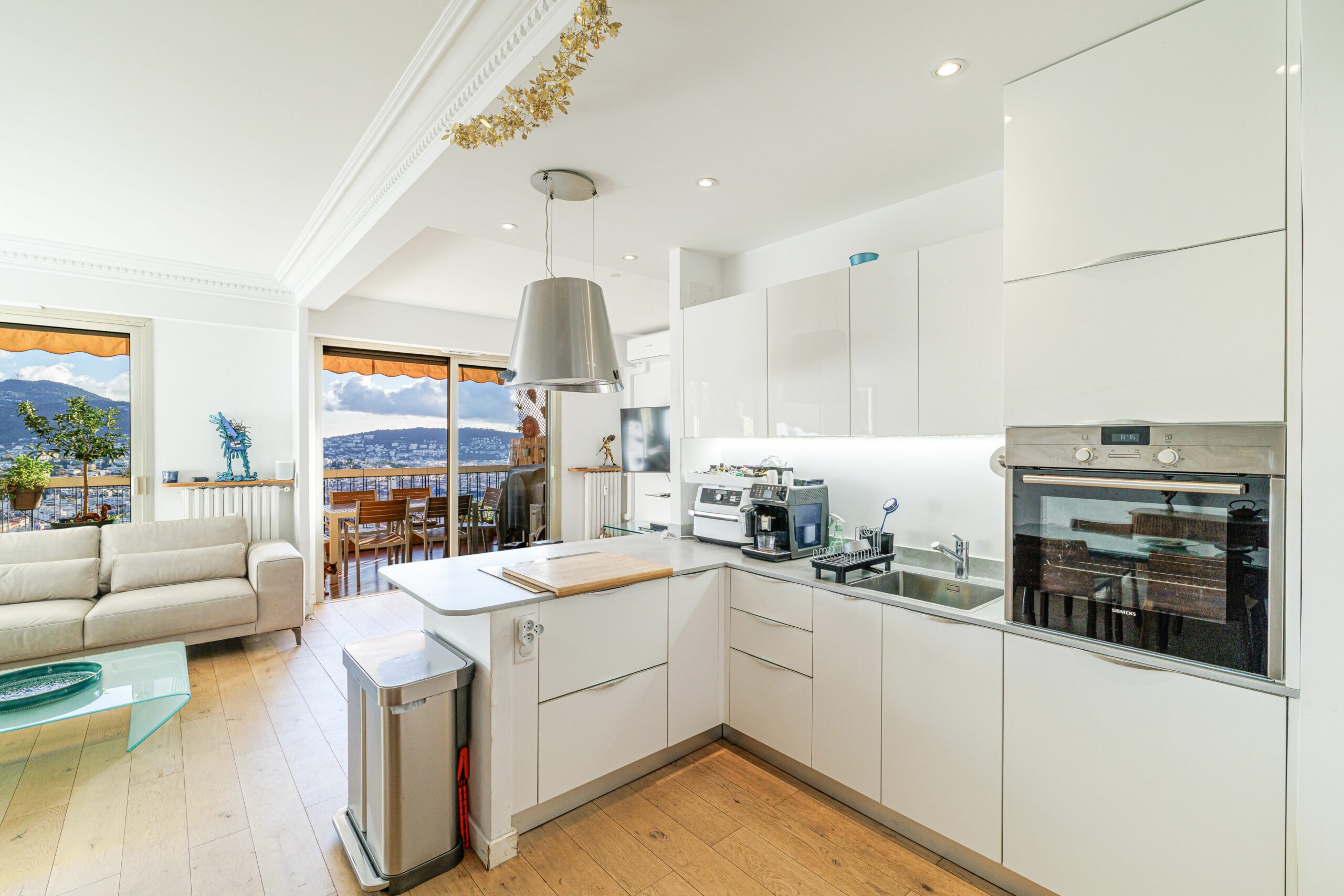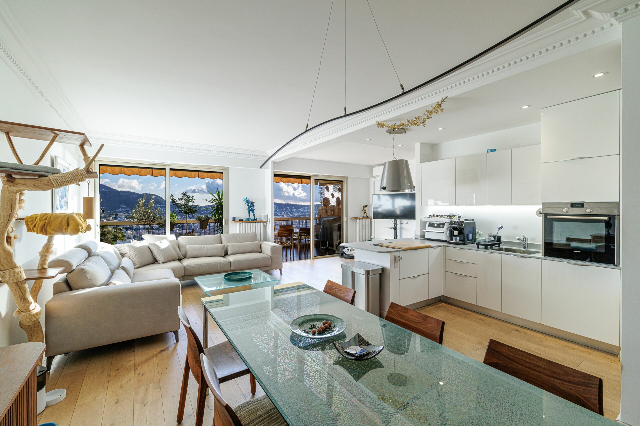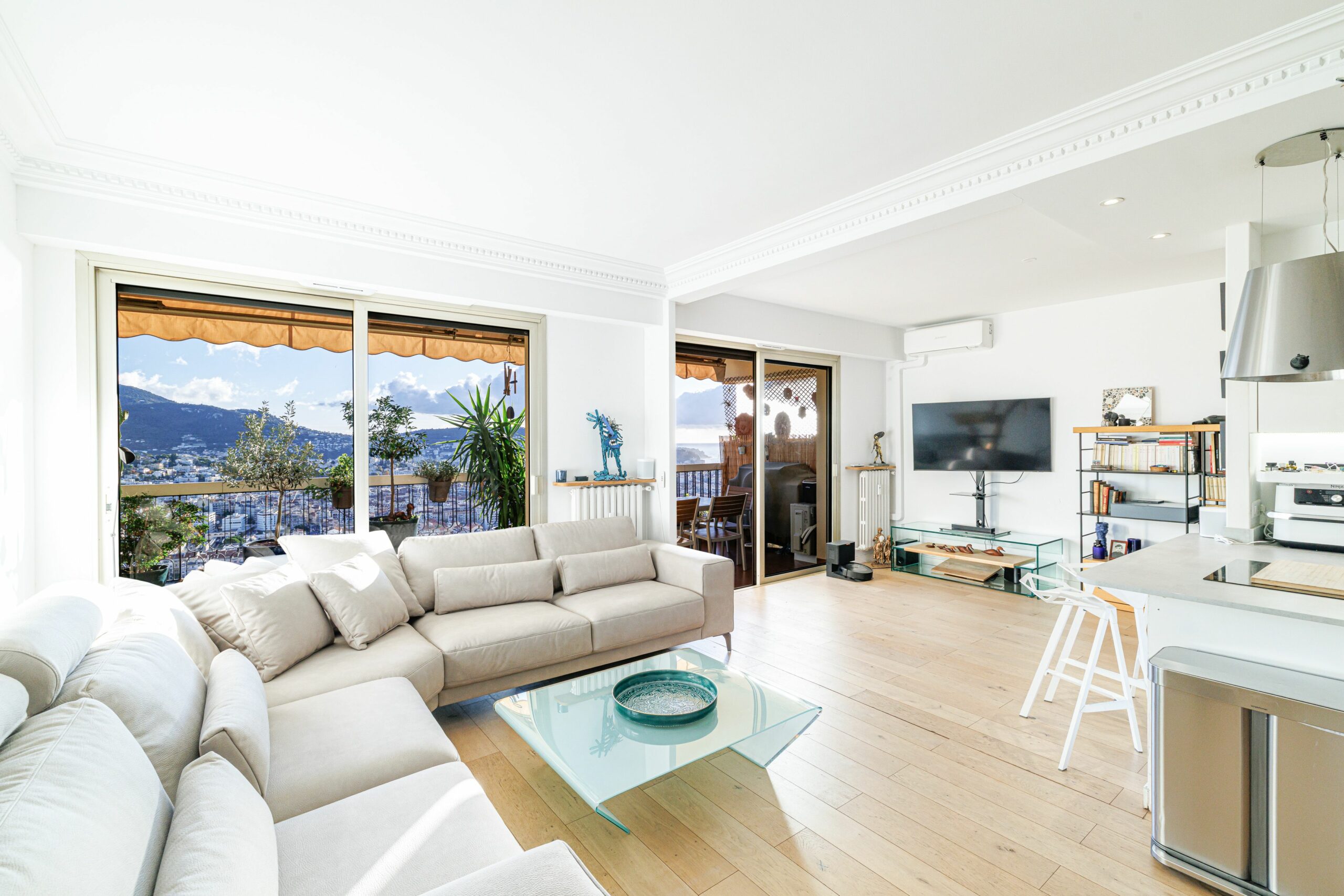 L’appartement s’ouvre sur une entrée accueillante menant à un vaste séjour lumineux, donnant accès à une première terrasse avec une vue dégagée exceptionnelle sur la mer, la ville et les montagnes.