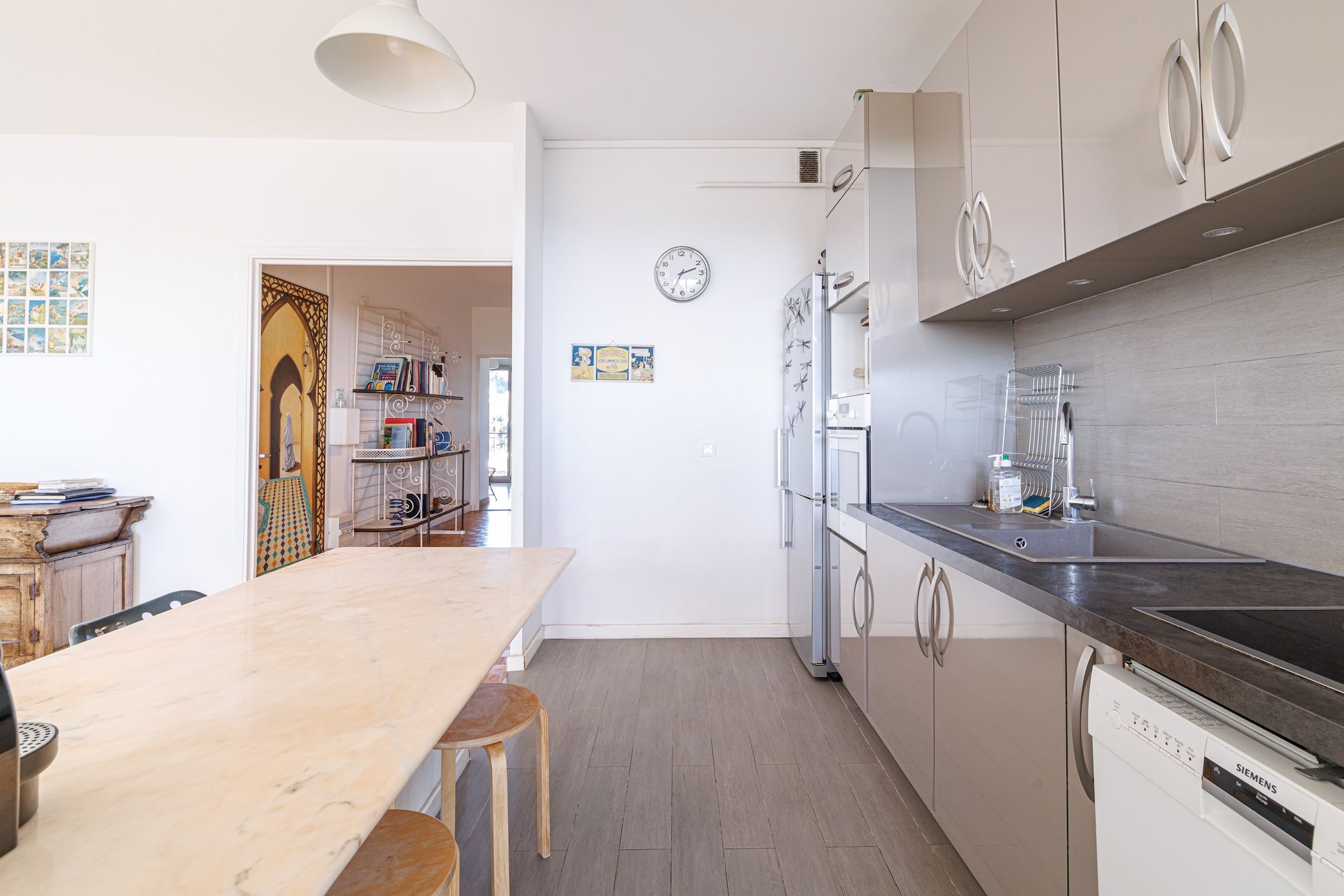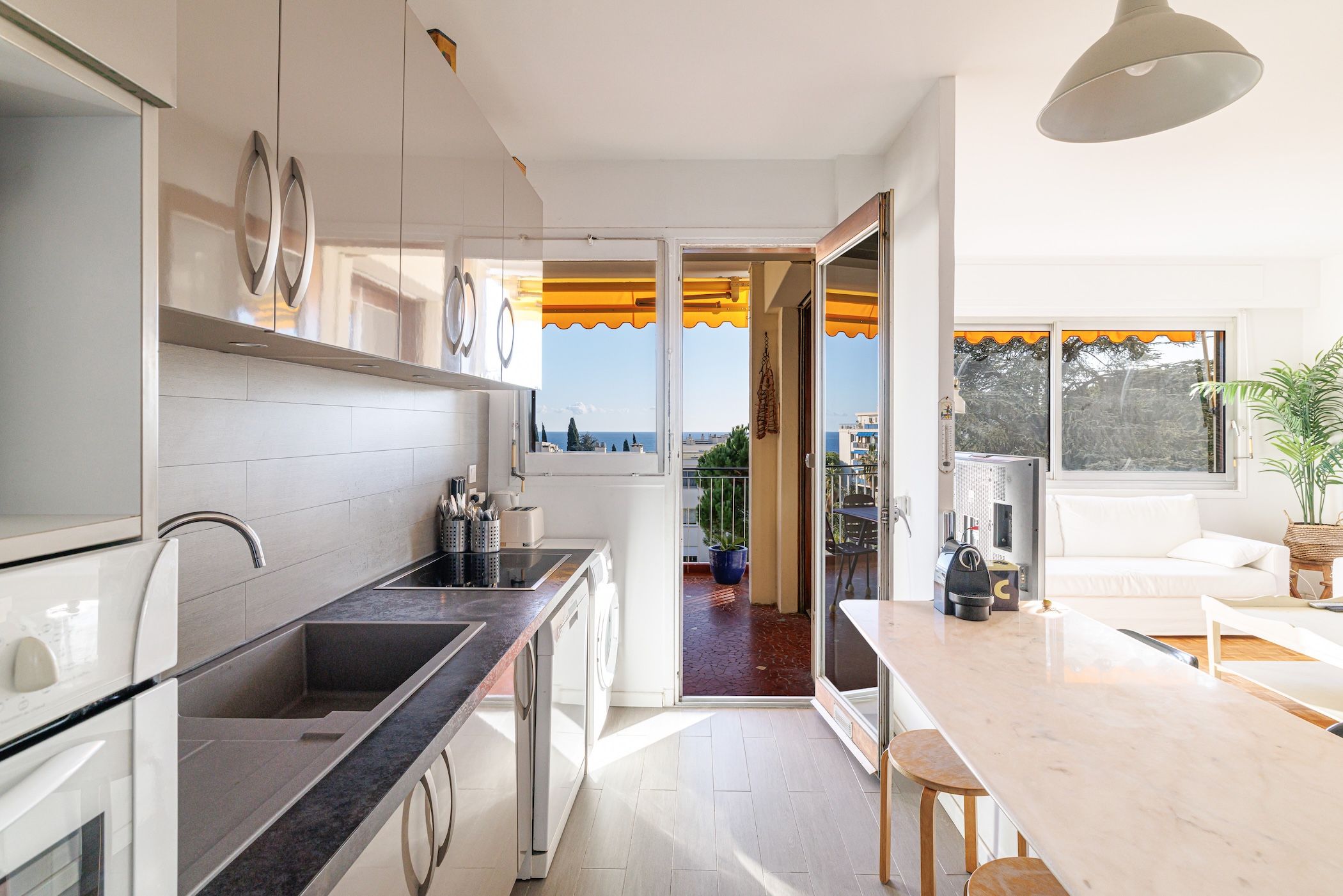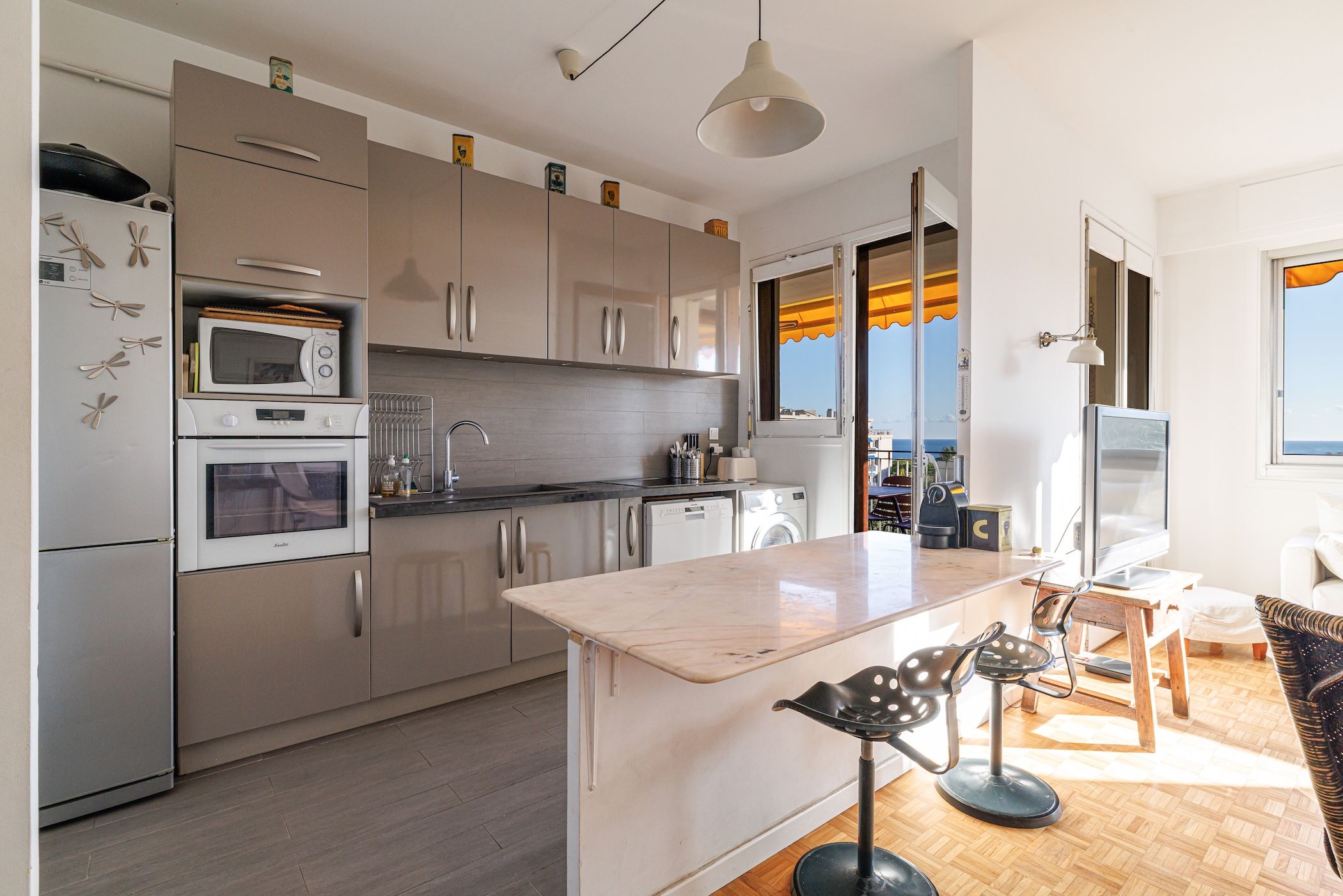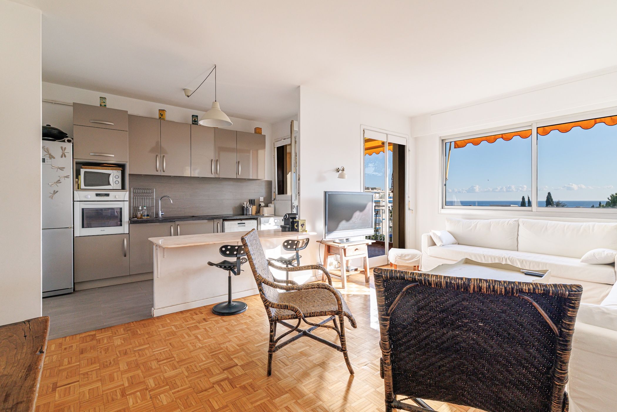 -Espace vie : Séjour lumineux et cuisine équipée sur terrasse face à la mer.