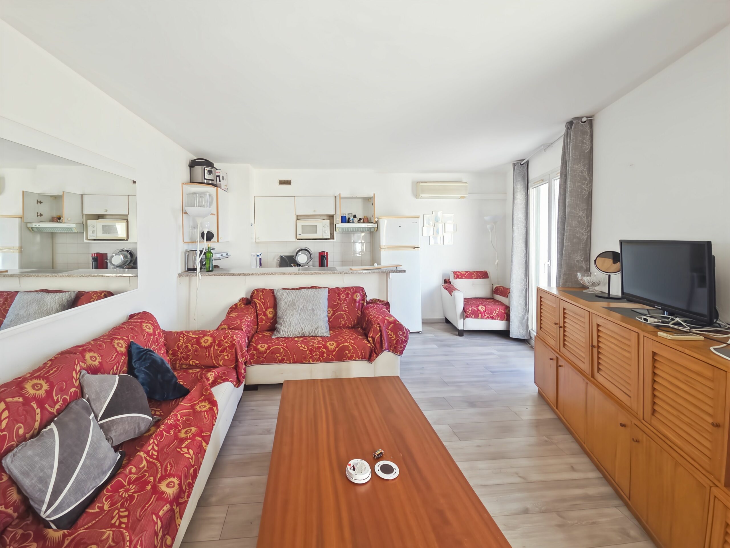 A bright living room with a fully fitted and equipped open-plan kitchen, opening onto a pleasant 8.60 m² terrace,