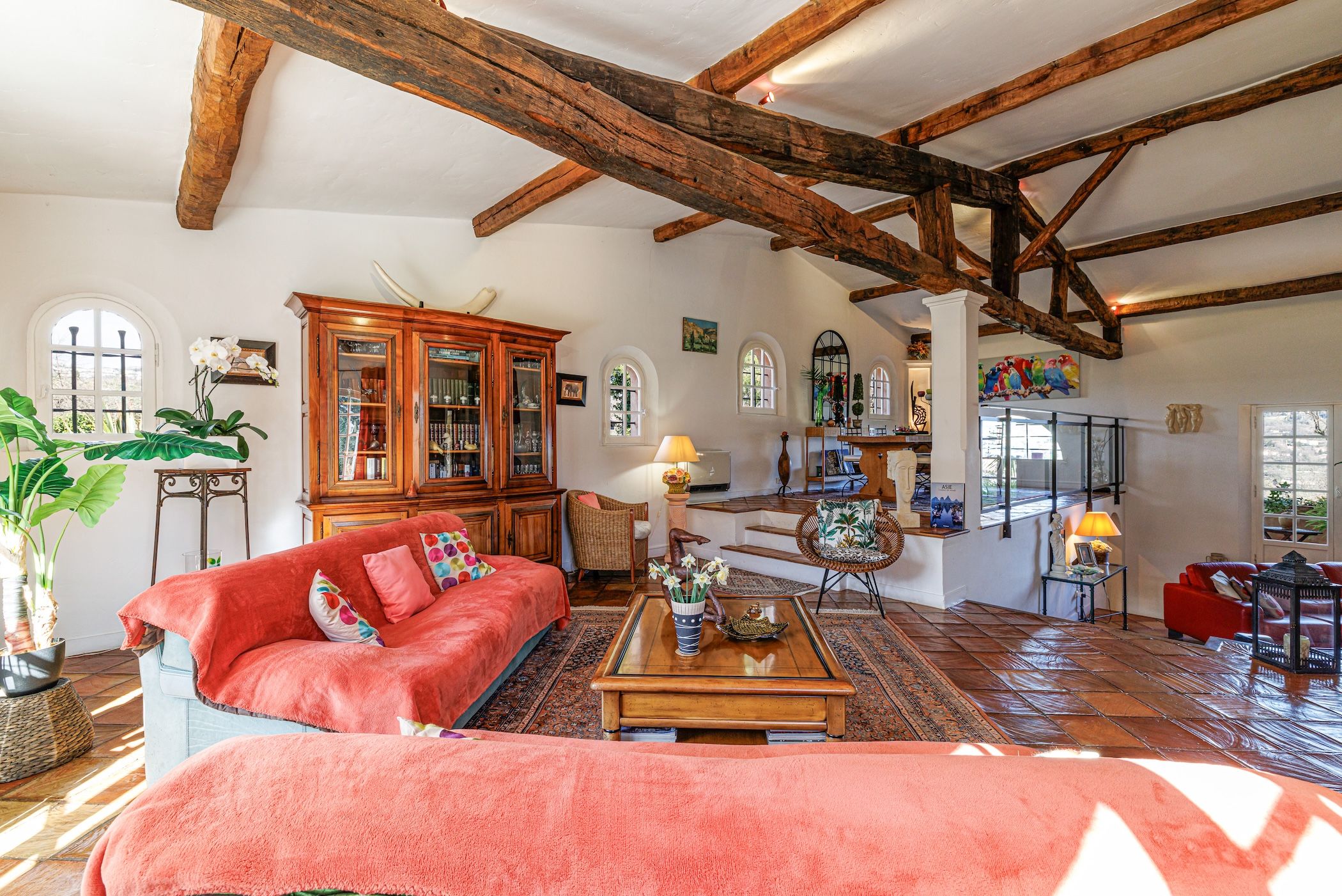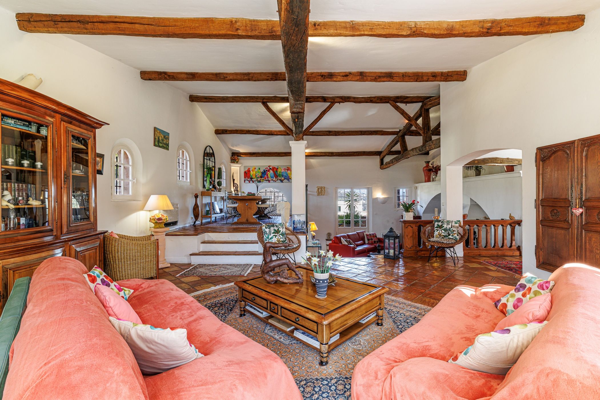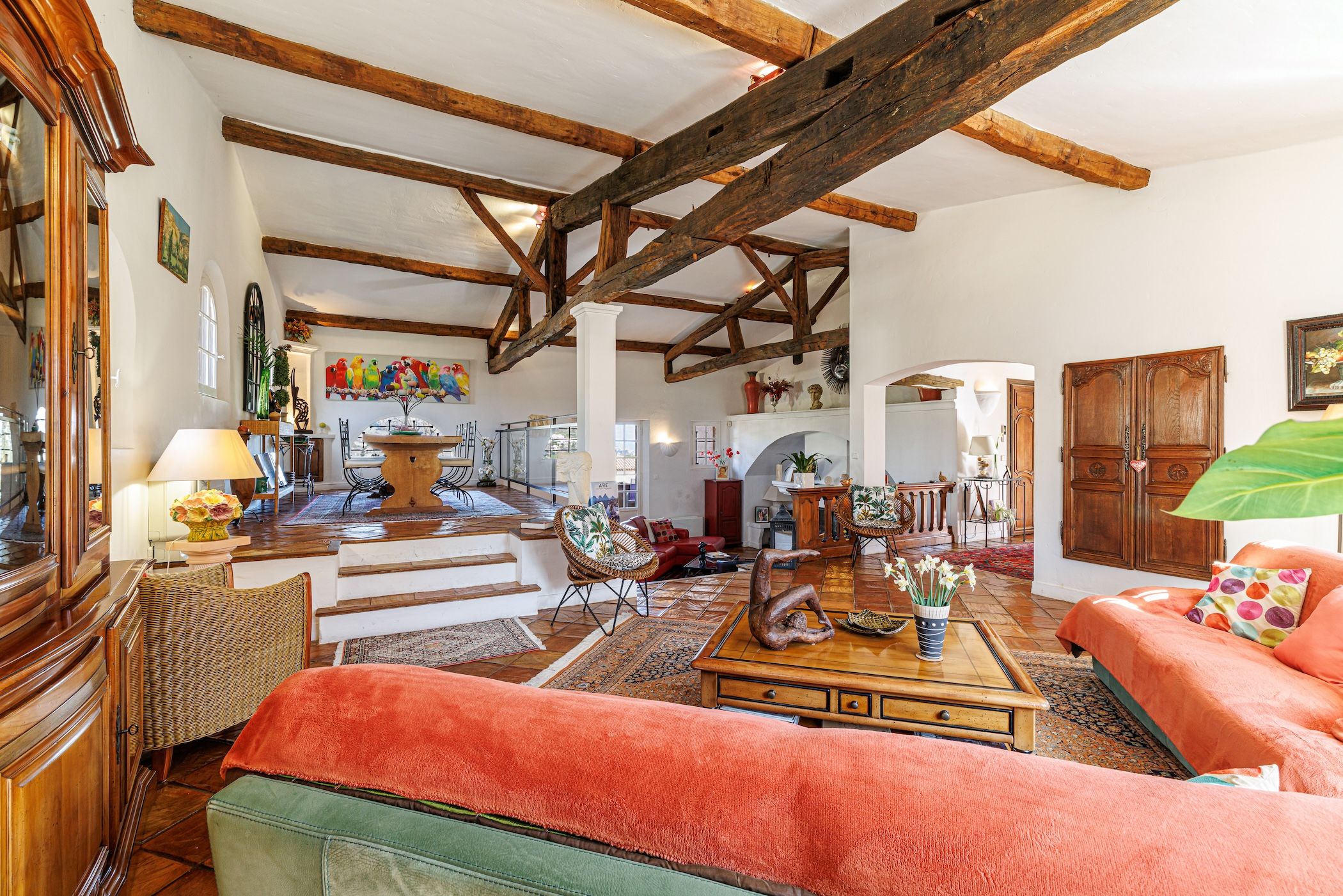 -Un magnifique triple séjour cathédrale d’environ 90 m², avec poutres apparentes, cheminée et sols en terre cuite, offrant de très beaux volumes et une atmosphère chaleureuse.
