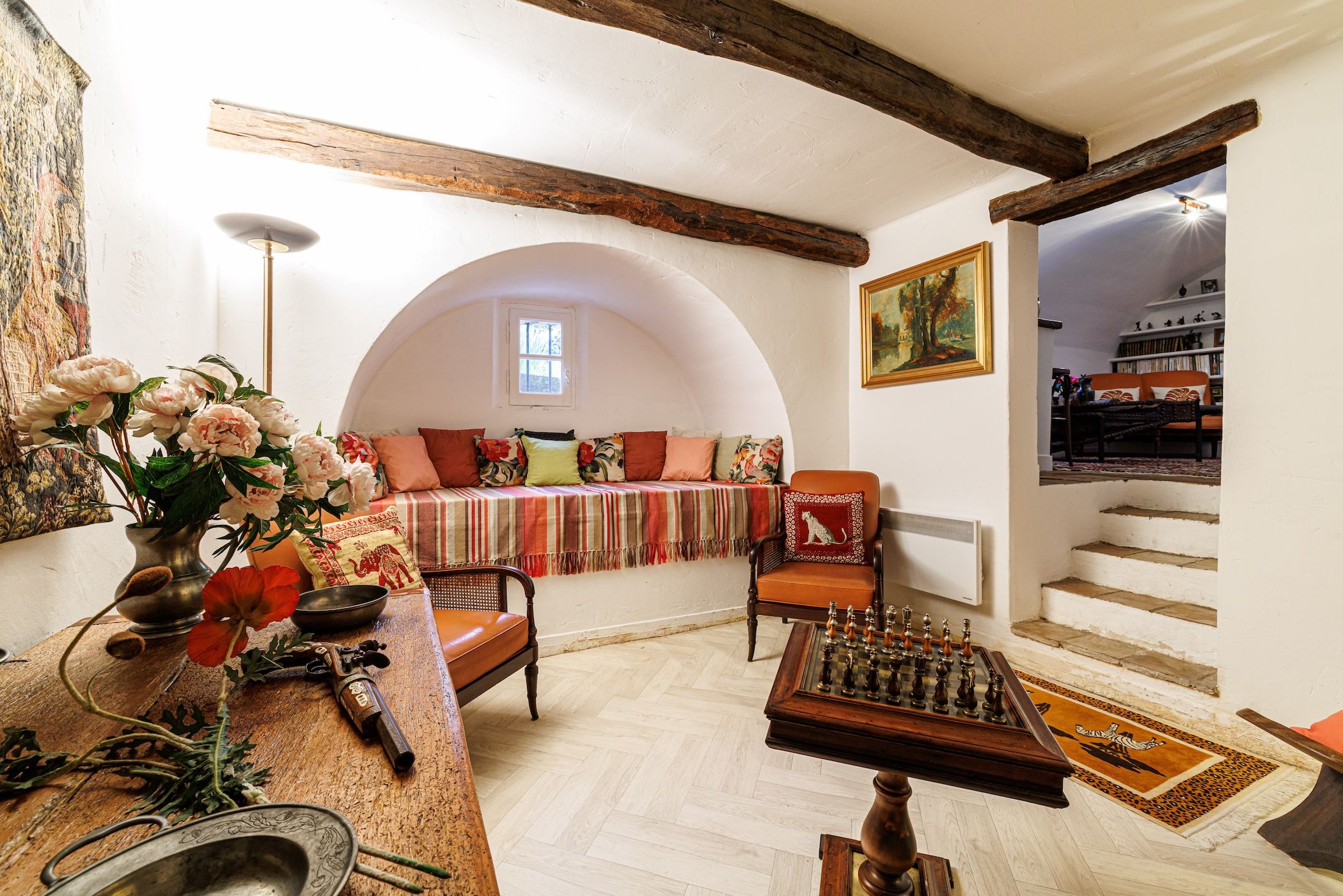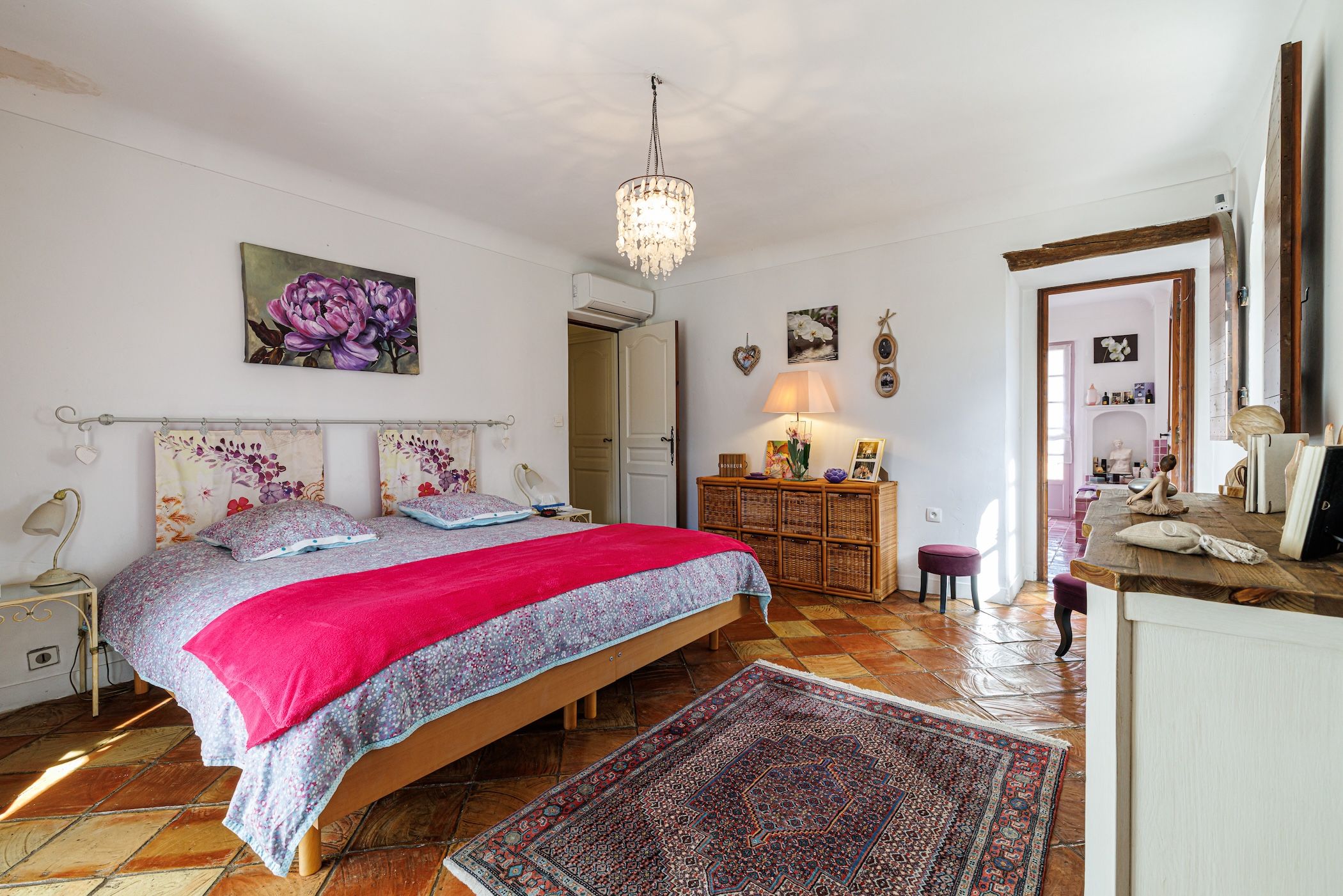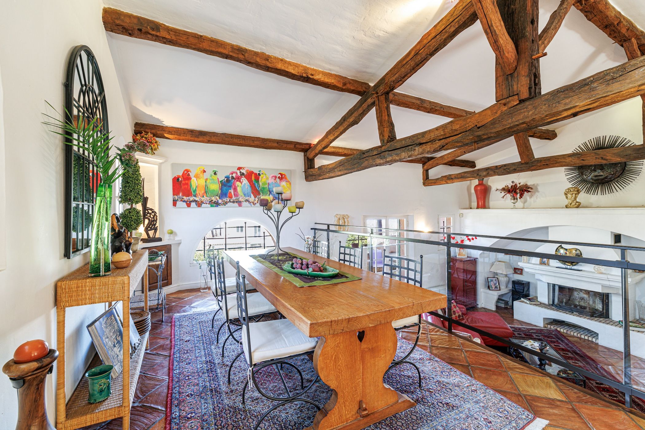 -Un magnifique triple séjour cathédrale d’environ 90 m², avec poutres apparentes, cheminée et sols en terre cuite, offrant de très beaux volumes et une atmosphère chaleureuse.