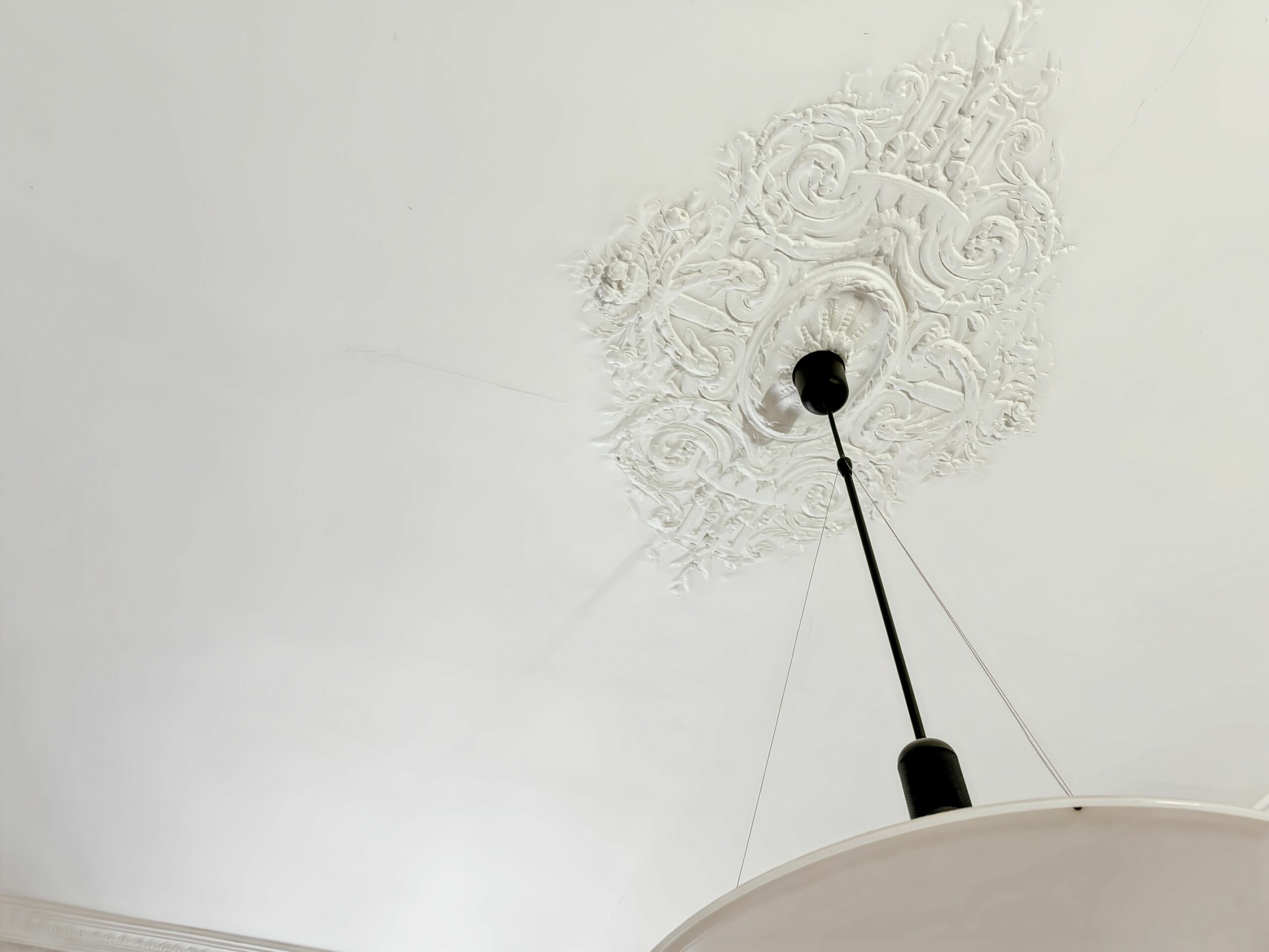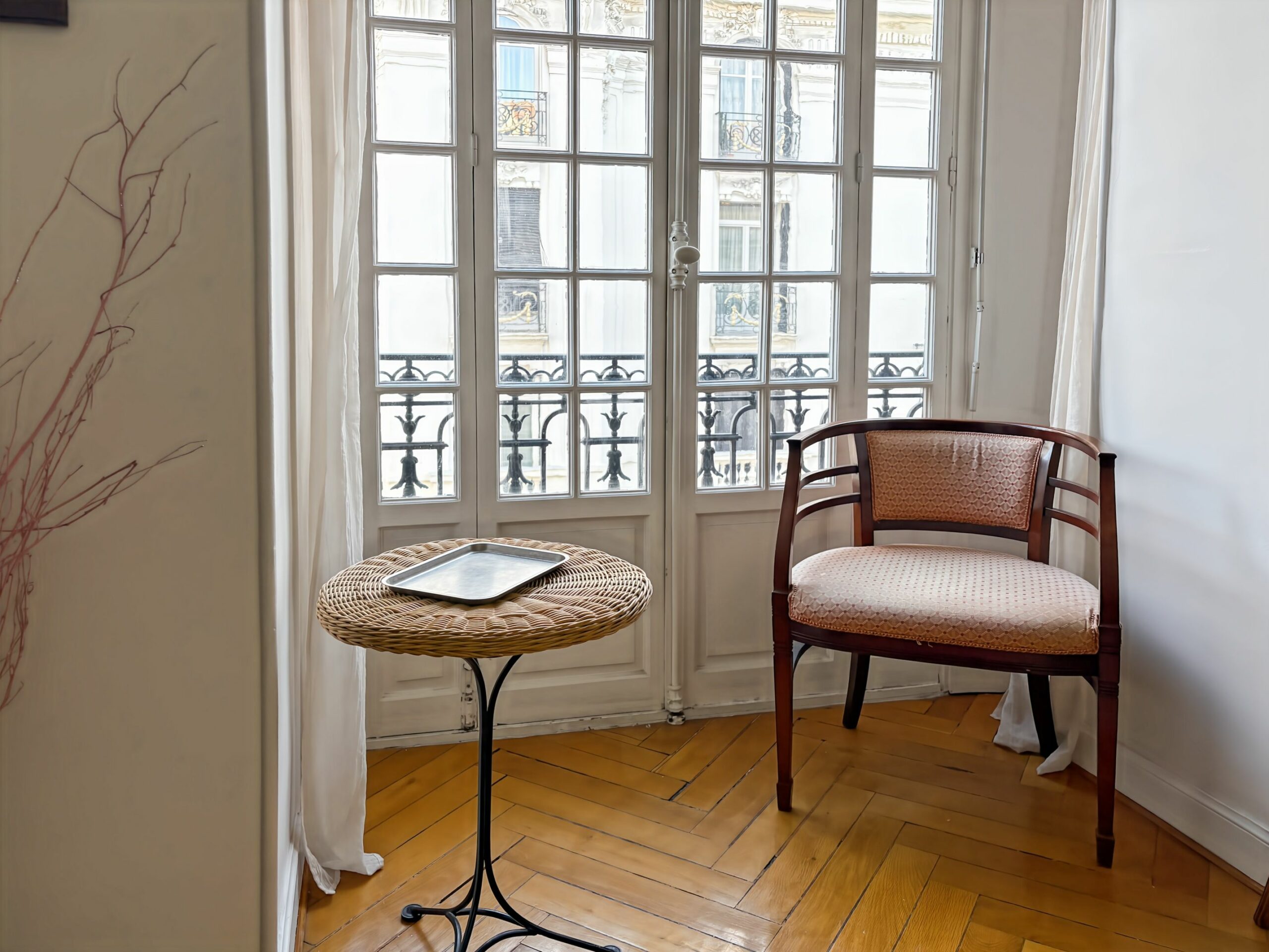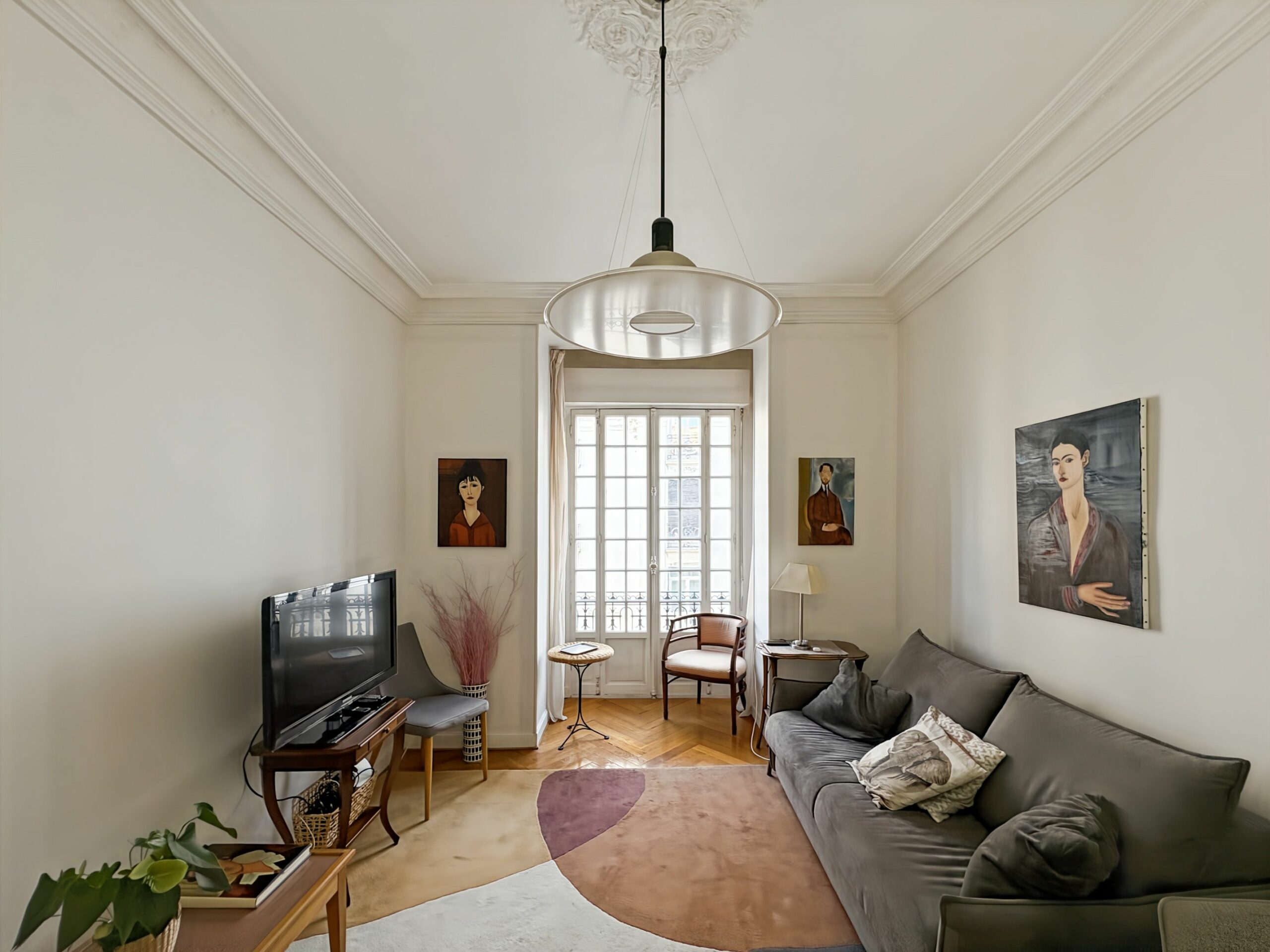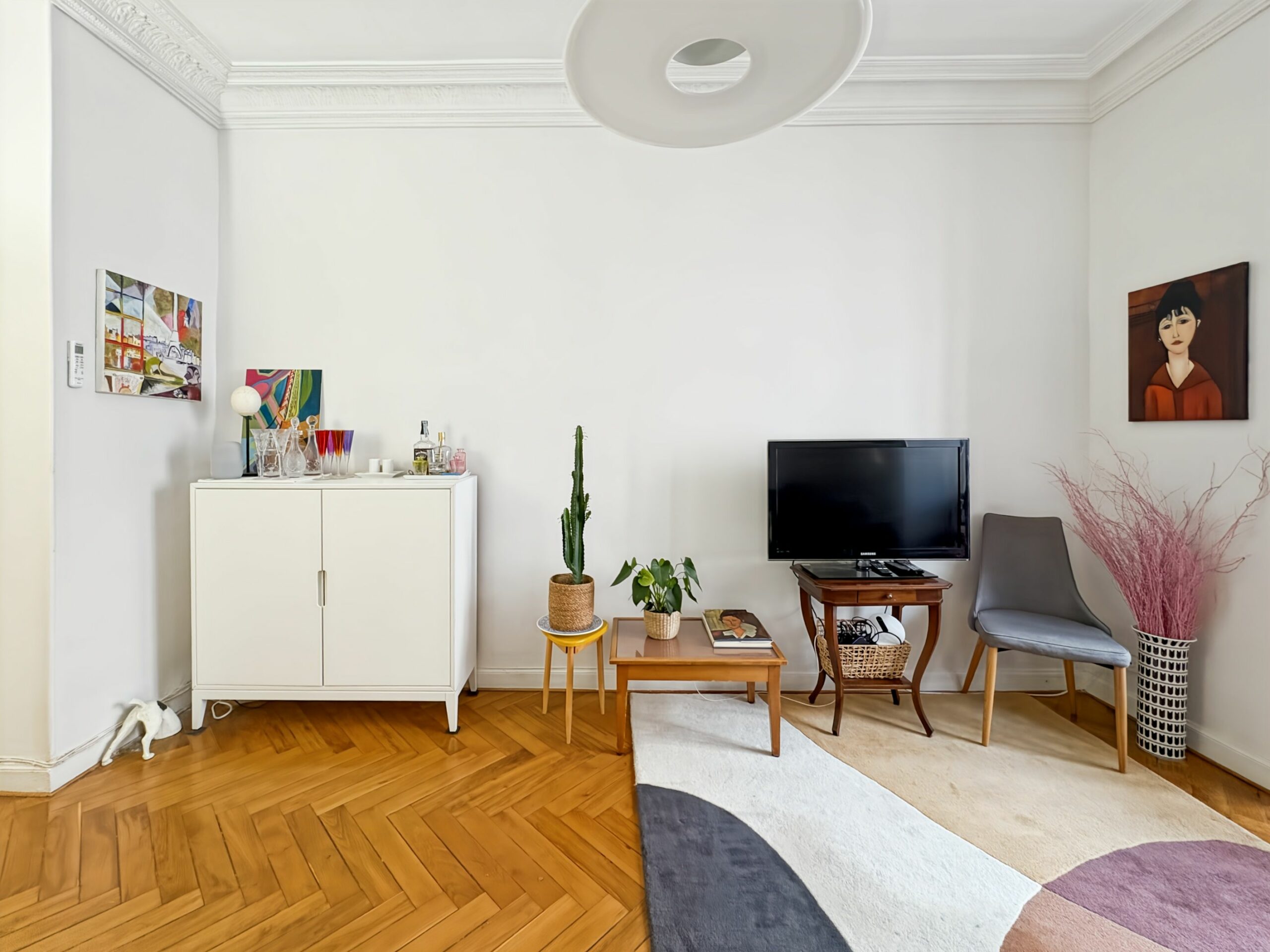 The apartment features beautiful volumes and the charm of classic architecture: elegant moldings, a decorative ceiling medallion, and herringbone parquet flooring.