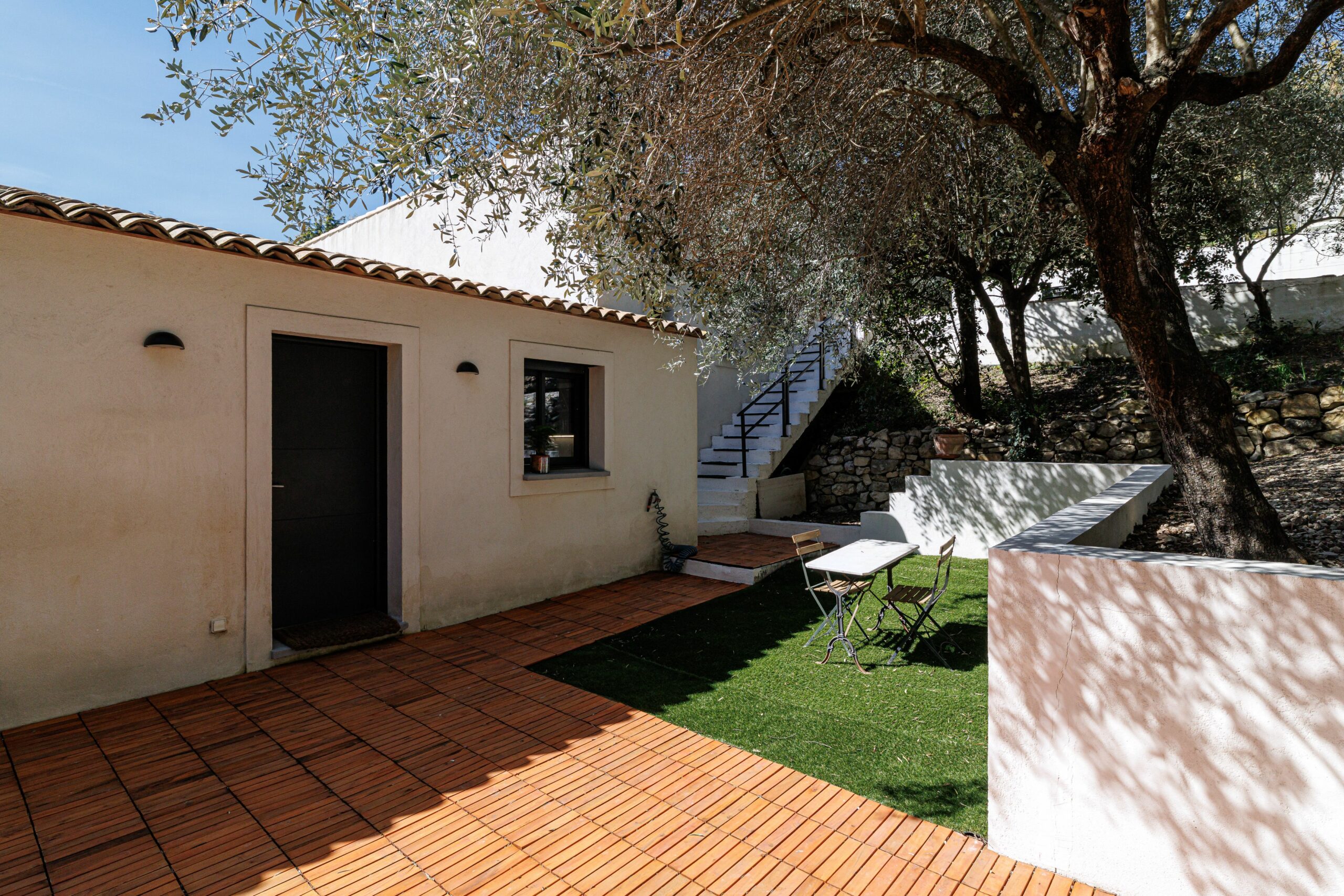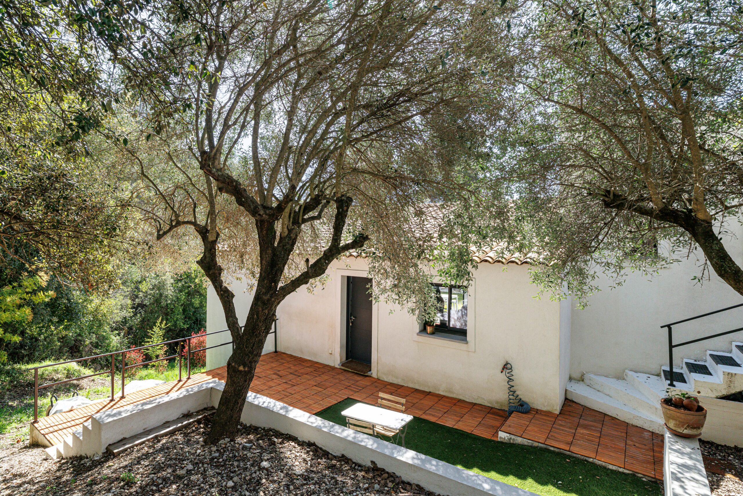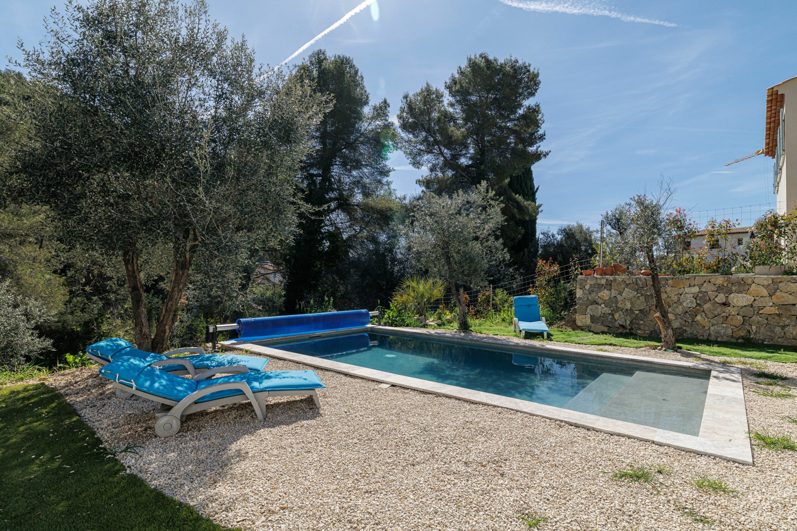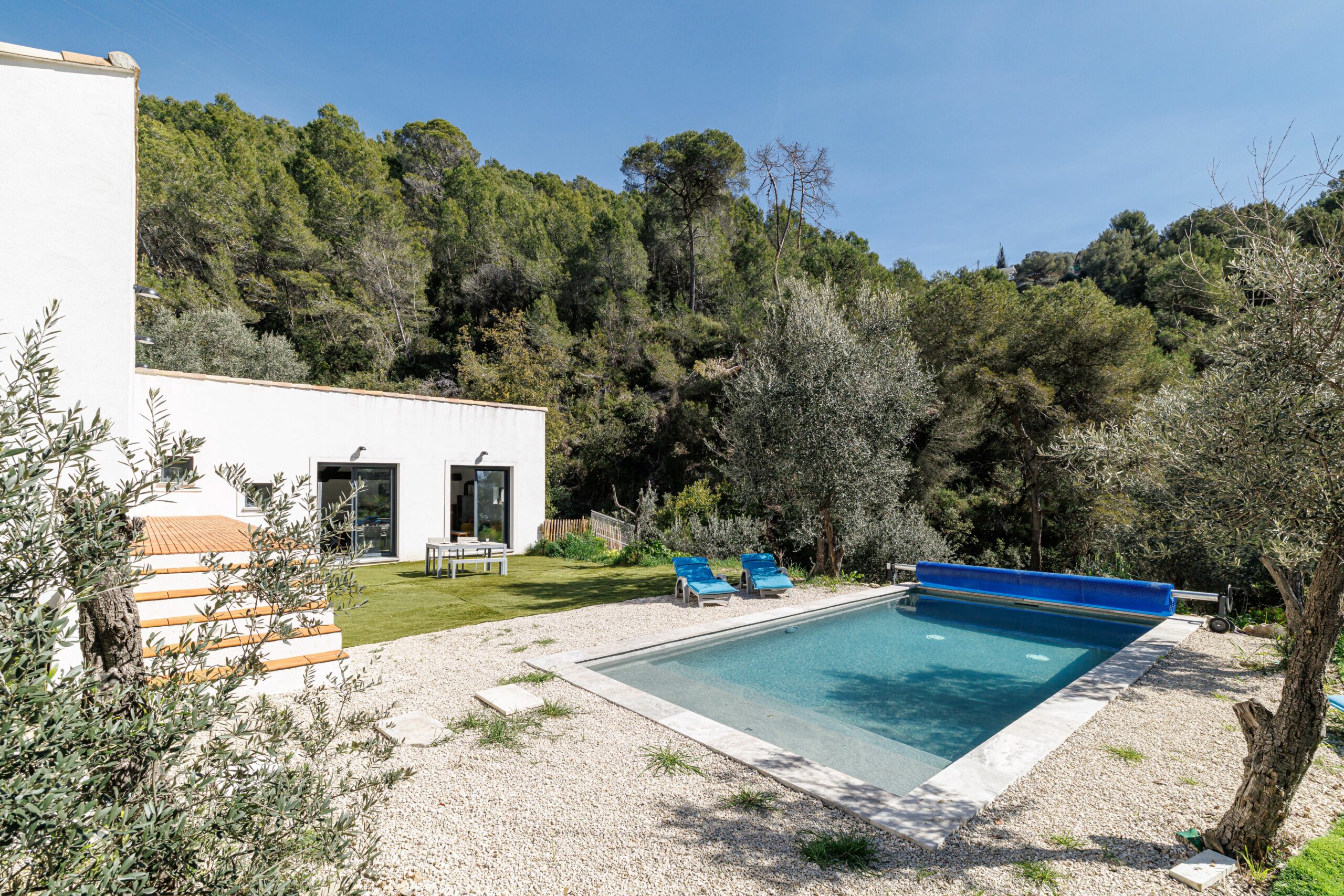 À l’extérieur, la propriété séduit par son jardin paysager aux essences méditerranéennes — oliviers, chênes, mimosas et palmiers — agrémenté d’une piscine de 3,5 × 7 m, idéalement exposée est-sud-ouest.